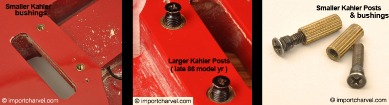 It is said that the serial numbers for Import Charvels started at 220000 for the 1986 product line. Japanese Charvels with the Kahler 2500 bridge mounted with a very low serial number, say 220000-240000, would have these SMALLER brass bushings and post type like the ones pictured above.